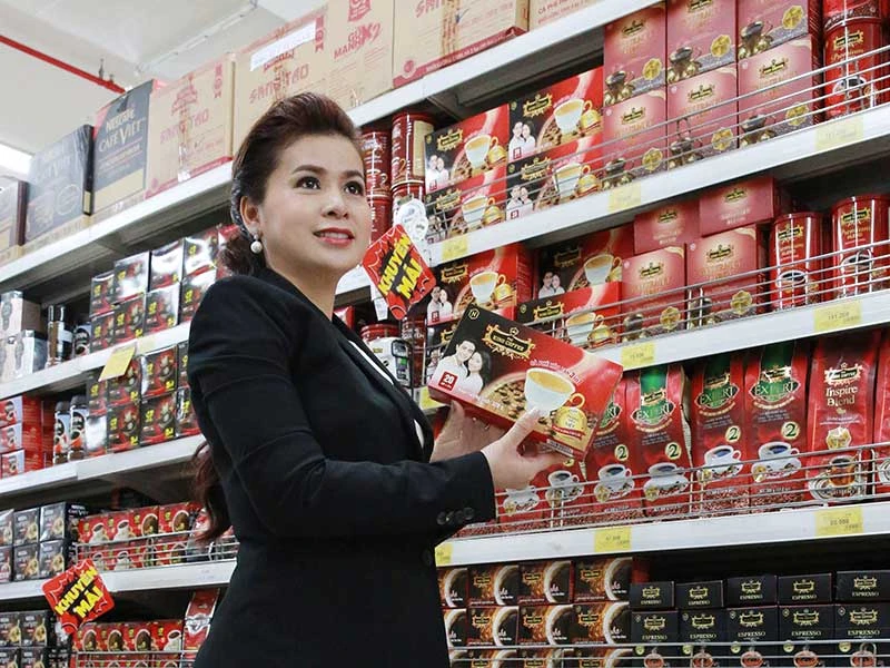 Bà Lê Hoàng Diệp Thảo quảng bá thương hiệu King Coffee tại một hệ thống siêu thị trong nước. Ảnh: MD