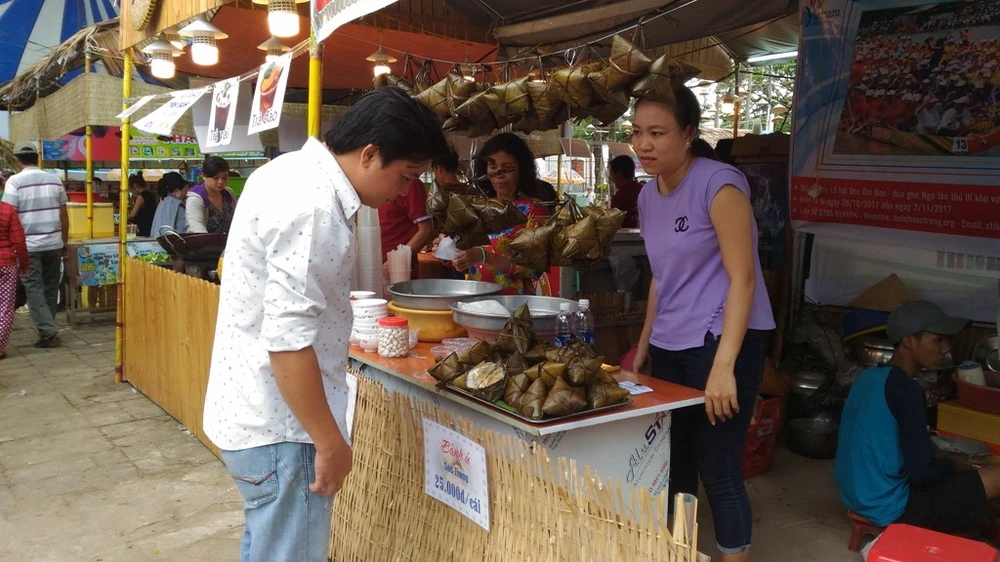 Khách hàng ghé hỏi mua bánh ú Sóc Trăng tại Lễ hội Bánh dân gian Nam bộ ngày 5-4. Ảnh: N.NAM