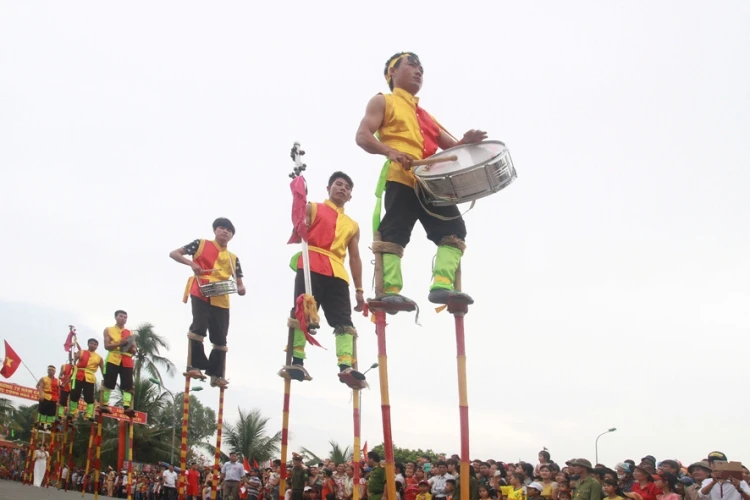 Các nghệ nhân đi cà kheo biểu diễn trống