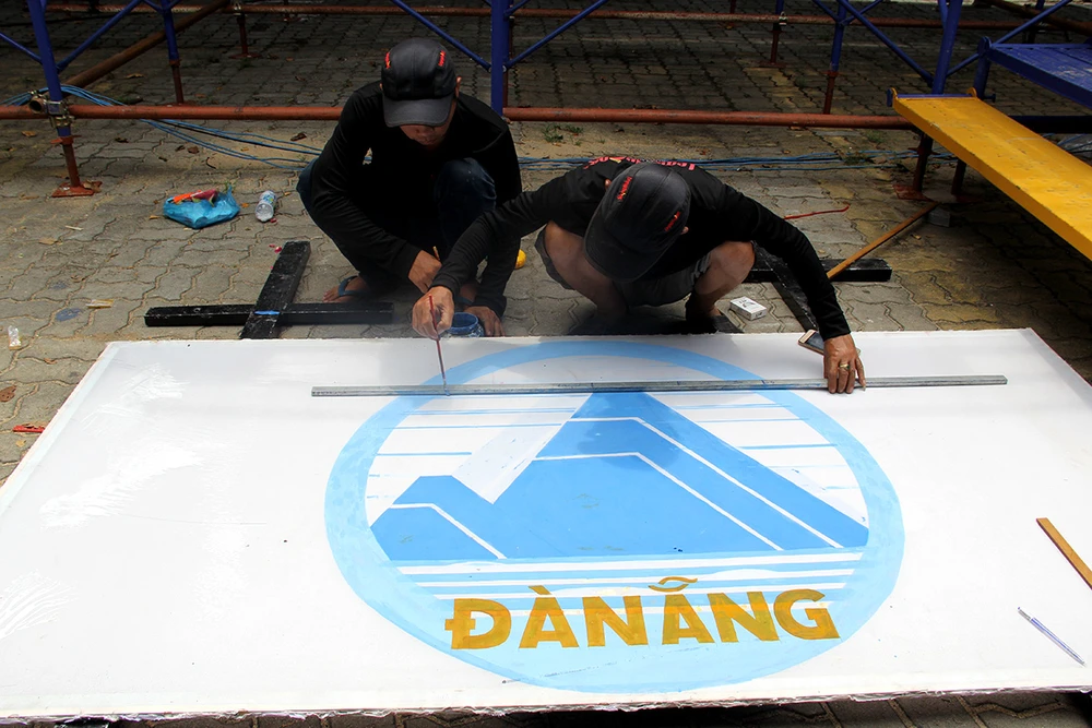 Các công nhân đang hoàn thành những công việc cuối cùng để chuẩn bị cho Lễ hội pháo hoa khai mạc vào đêm 30-4. Ảnh. N.TRI
