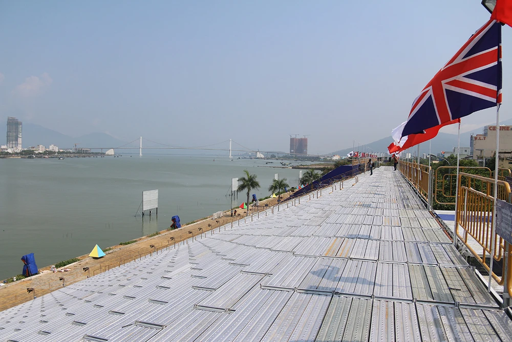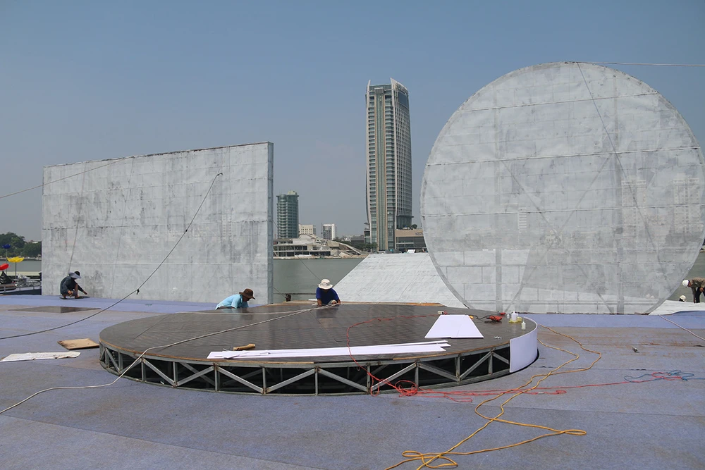 Với diện tích 1.000 m2, ban tổ chức phải mất hơn 60 ngày thi công và phải sử dụng 120 tấn thép. Hiện sân khấu đã gần như hoàn thiện. Ảnh. N.TRI