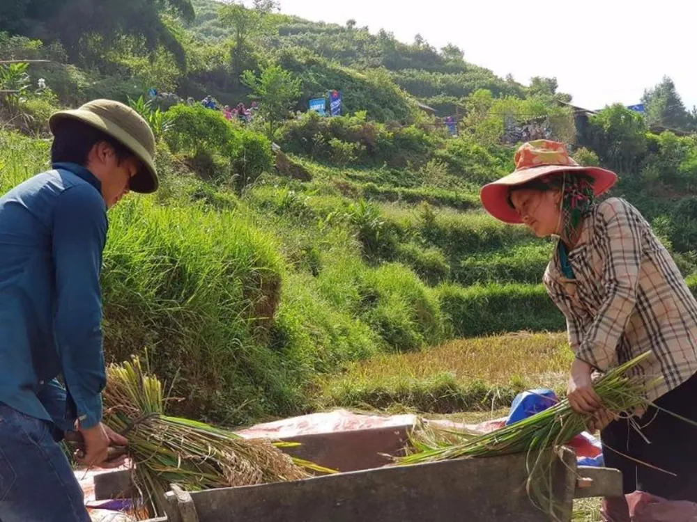 Một gia đình người H'Mông vẫn thu hoạch lúa theo phương pháp truyền thống khi phía trên họ là cuộc hò reo chinh phục đường núi trong một cuộc đua marathon. Ảnh: Internet