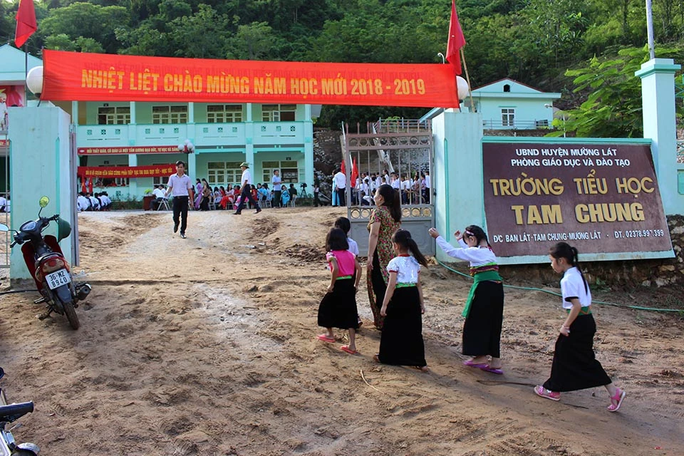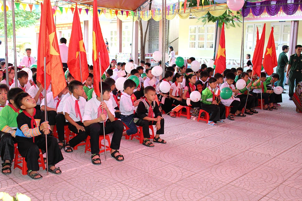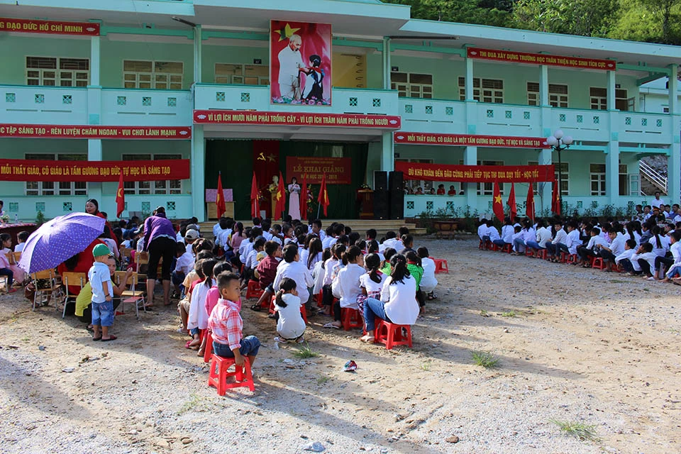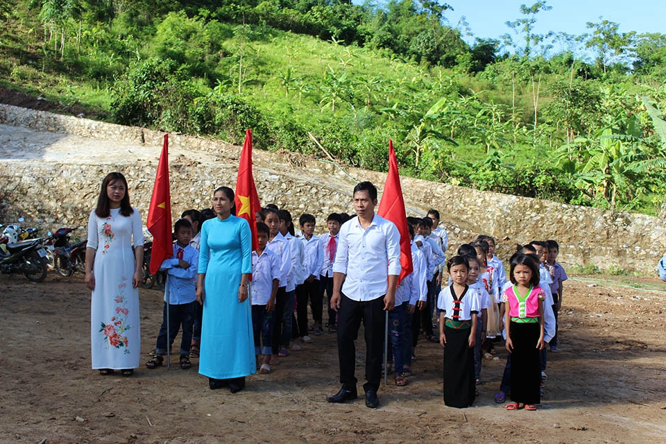 Cô trò vùng cao Mường Lát trong lễ khai giảng.