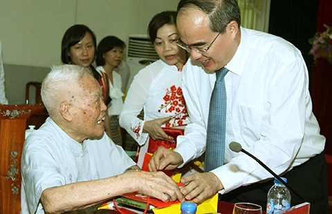 Chủ tịch Ủy ban Trung ương MTTQ Việt Nam Nguyễn Thiện Nhân tặng quà cho nguyên Bí thư Thành ủy Hà Nội Nguyễn Văn Trân. Ảnh: TTXVN