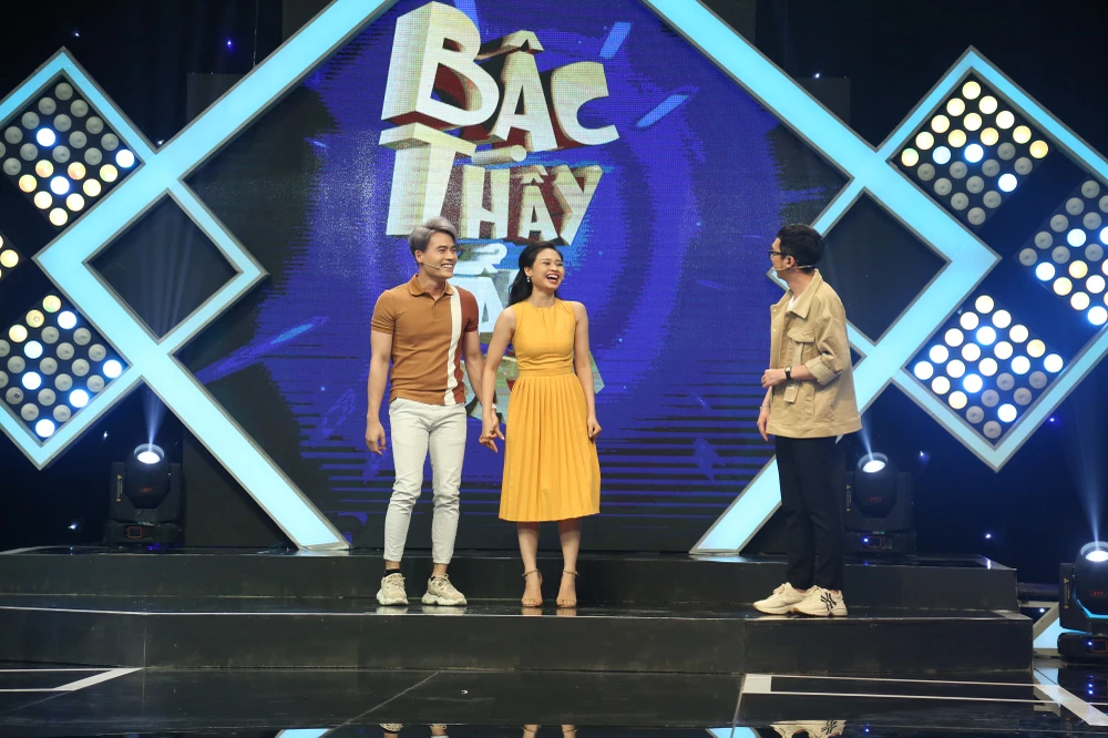 Chịu không nổi điệu cười đó, MC Minh Xù buộc lên tiếng: “Hai đứa bớt cười vô mặt nhau lại” còn dàn khách mời thì ngồi xổm chống tay coi cặp đôi làm lố trên sân khấu.