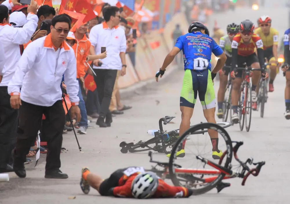 Cú té bất ngờ khiến tay đua người Hóc Môn lộn nhào, văng xe đúng lúc tay đua trẻ Nguyễn Văn Nhã (Quân Khu 7) đang tăng tốc cán ngang bổ nhào và nằm bất động.