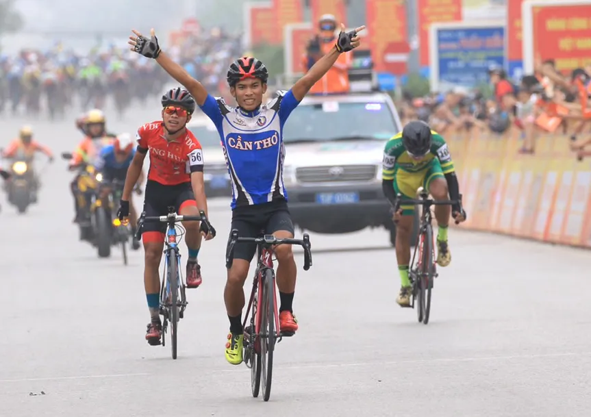 Tay đua Phan Tuấn Vũ ăn mừng chiến thắng chặng 6. ẢNH: ANH THUẬN