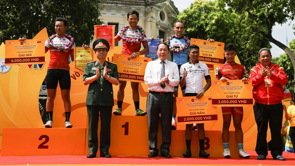 Các tay đua chiến thắng chặng khai mạc trên bục nhận giải thưởng. Ảnh: ANH HÙNG