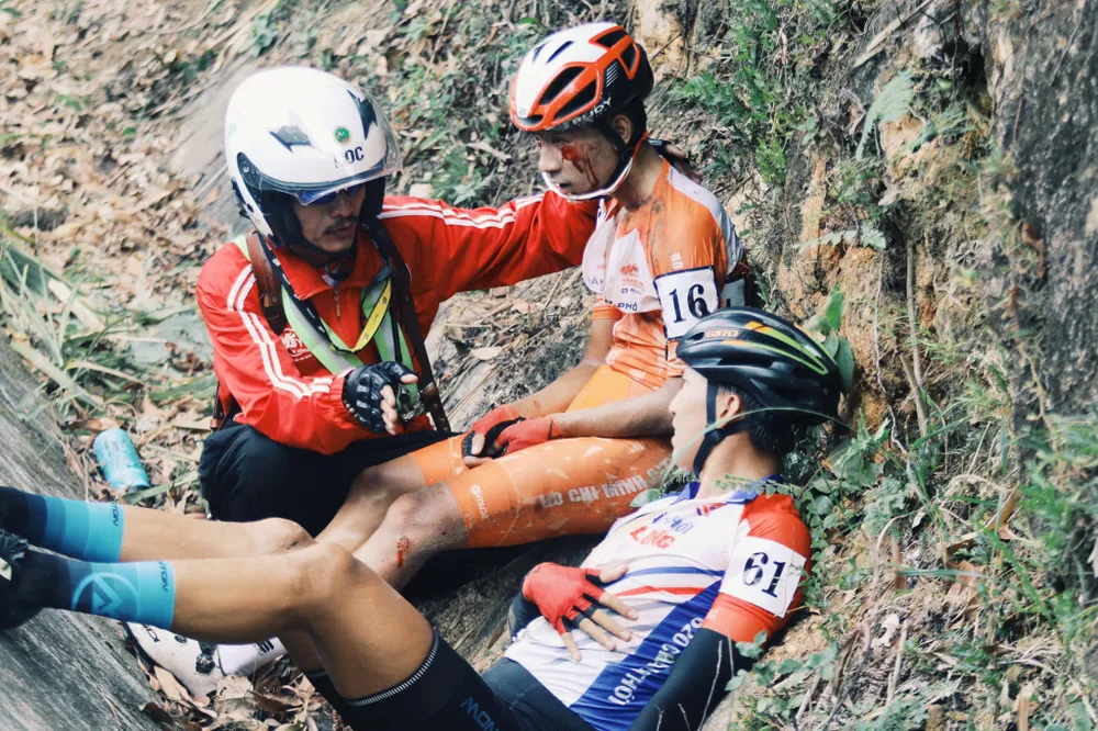 Ngọc Long (16), Minh Thiện (61) chia tay đường đua sau sự cố té ngã tại đèo Le ở chặng 6. ẢNH: NHƯ HUY