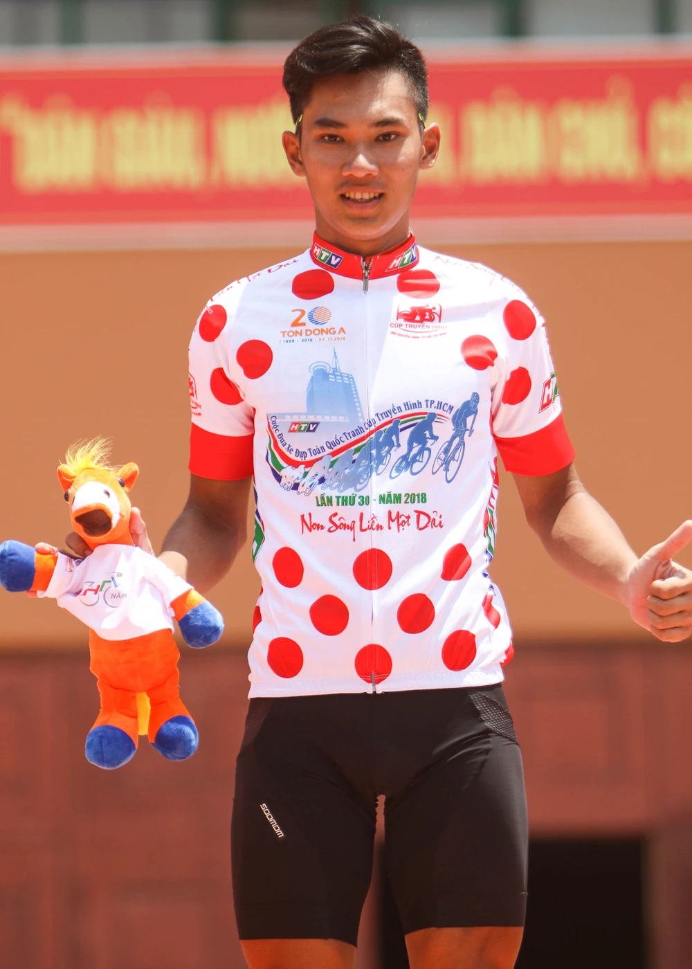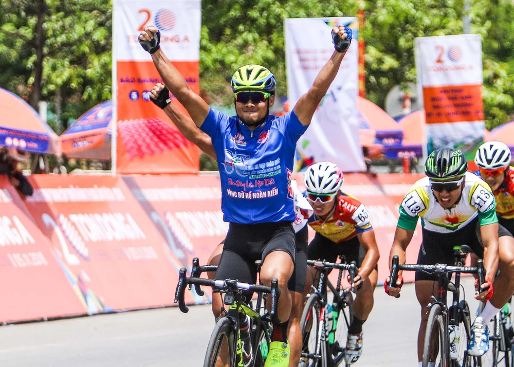 Tay đua Lê Nguyệt Minh mừng chiến thắng thứ hai tại Cúp Truyền hình 2018.
