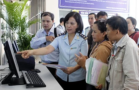 Cán bộ Chi cục Hải quan cửa khẩu Cảng Sài Gòn khu vực 1 tư vấn cho doanh nghiệp khai báo trên hệ thống thông quan điện tử tự động. Ảnh: Hoàng Hải