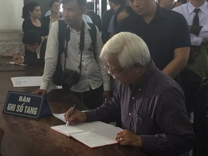 Nhà sử học Dương Trung Quốc đến viếng cụ bà Hoàng Thị Minh Hồ và ghi sổ tang.