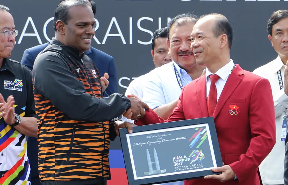 Đại diện nước chủ nhà Malaysia trao kỷ niệm cho phó đoàn TTVN Hoàng Quốc Vinh
