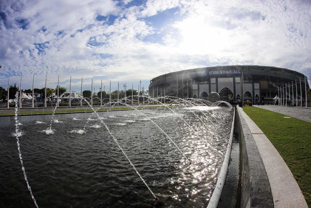 Toàn cảnh sân vận động Bukit Jalil sáng 16-8 rực rỡ dưới ánh nắng.