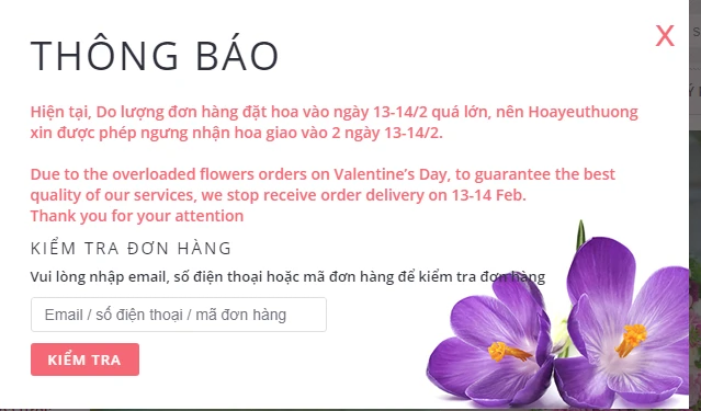 Trên Fanpage của một số hãng cung cấp dịch vụ hoa như cửa hàng Happy Flower hay Hoa Yêu thương thông báo ngưng nhận giao hoa tận nơi trong ngày lễ 14-2 vì đã quá tải. Những nơi này hiện chỉ nhận đơn mua trực tiếp tại cửa hàng.