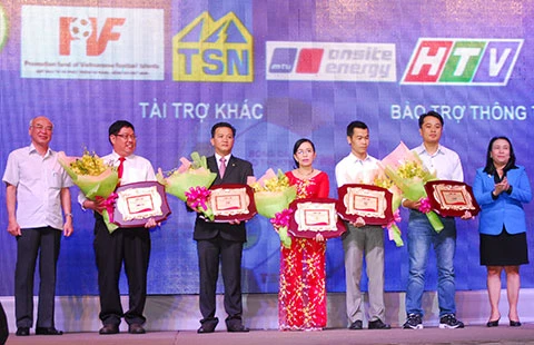 Các nhà tài trợ nhận kỷ niệm chương tại buổi trao giải Fair Play. Ảnh: HTD