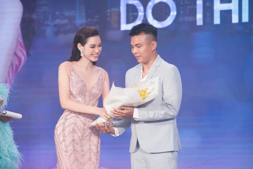 Đỗ Thị Hà trao hoa cho nhà thiết kế Đỗ Long.