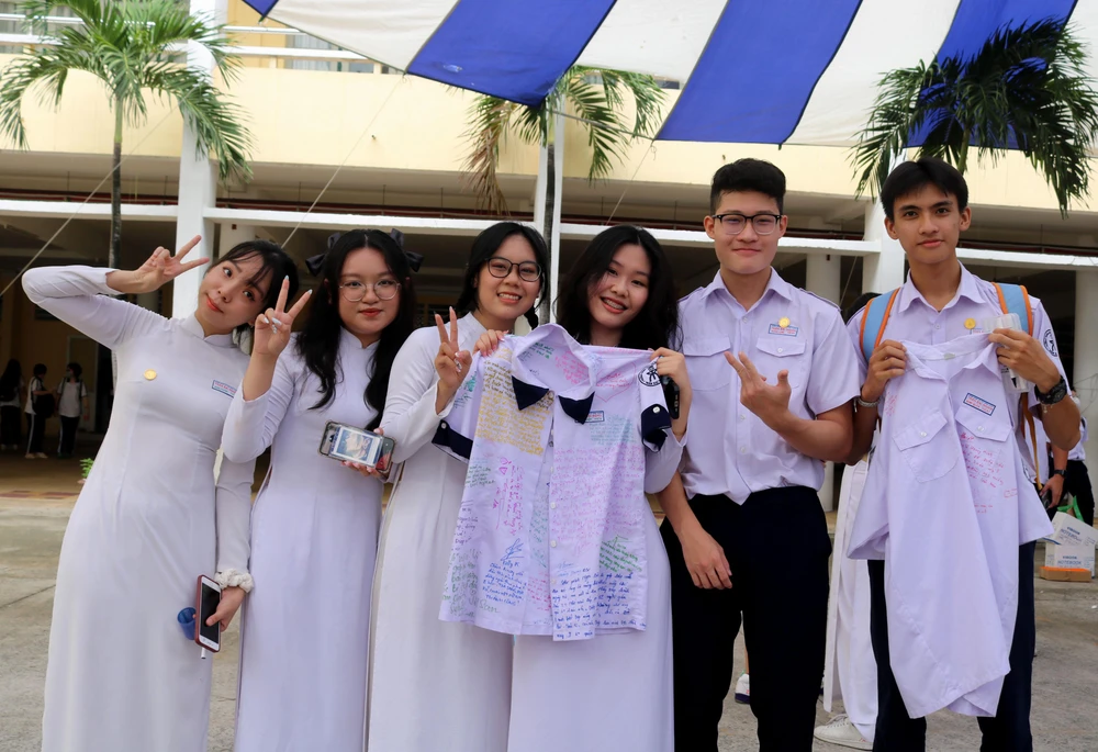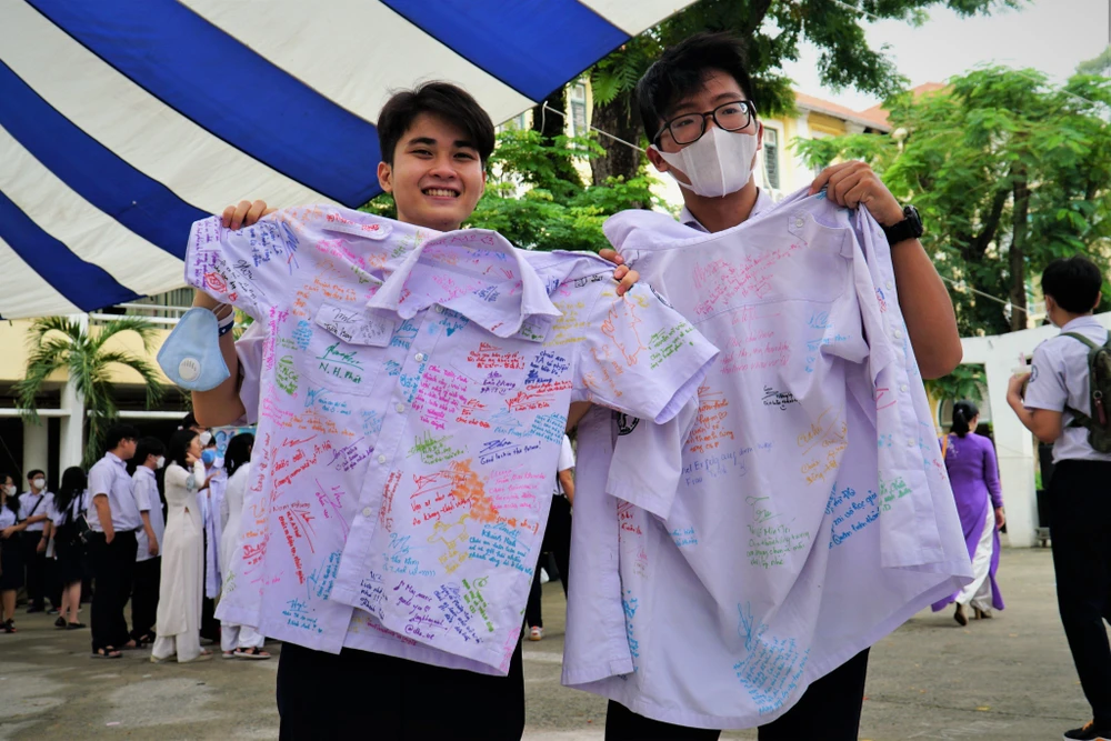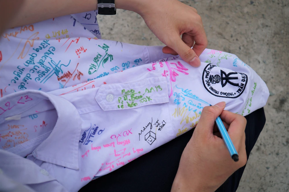 Những lời chúc tốt đẹp của thầy cô, bạn bè được các em học sinh lưu giữ lại trên chiếc áo đồng phục.
