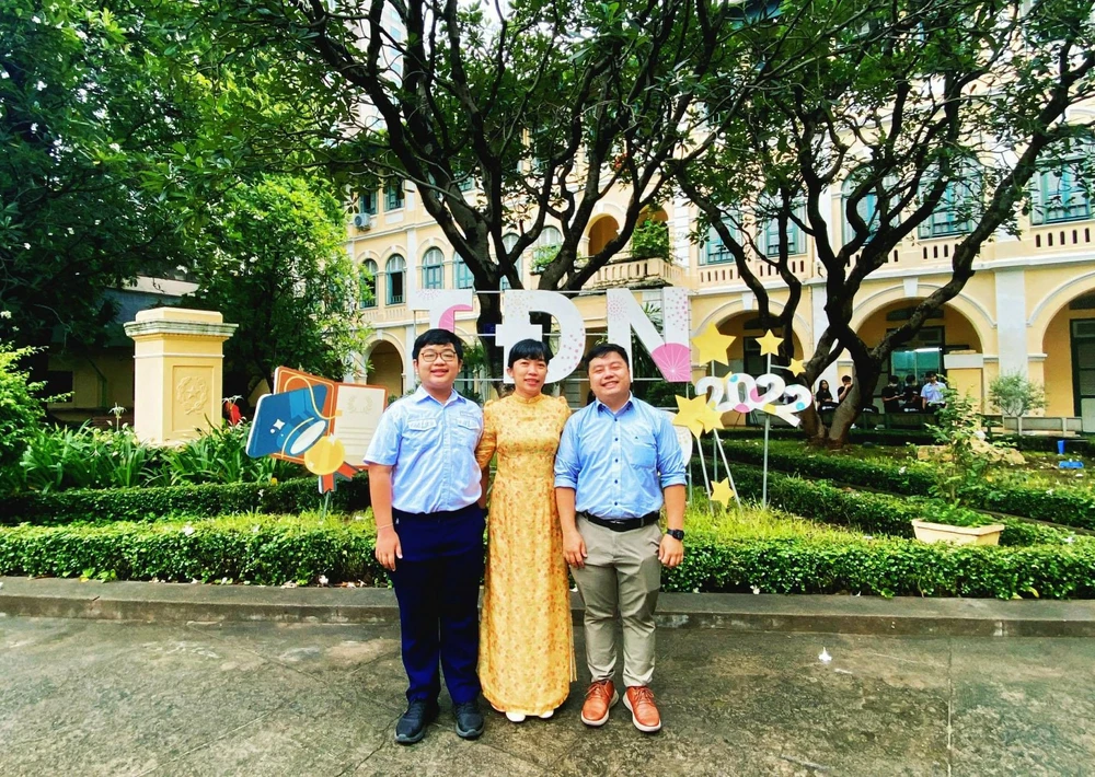 Cô Trần Thị Hồng Thủy cho biết cô bắt đầu nghề dạy học tại trường THPT chuyên Trần Đại Nghĩa từ ngày thành lập trường. Khang (bìa trái) là học sinh lớp 6 cô chủ nhiệm đầu tiên cũng là lứa học trò đầu tiên của trường.