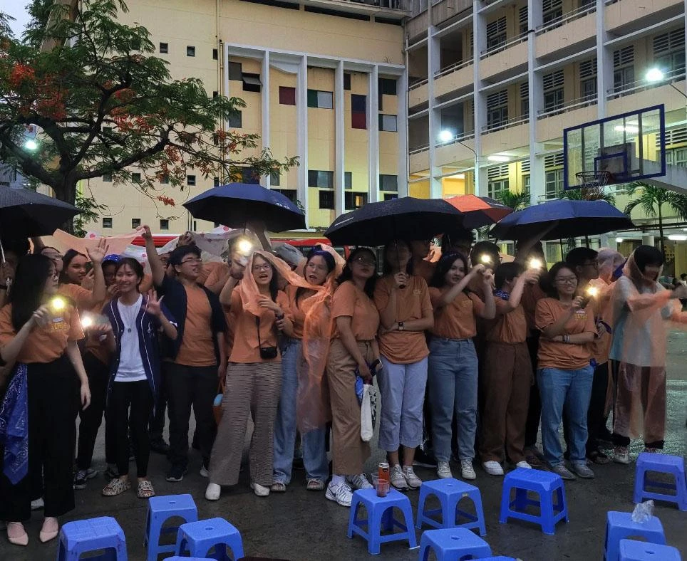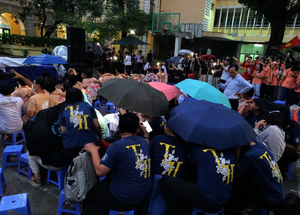 Các bạn học sinh đội mưa tham gia những tiết mục văn nghệ cuối chương trình.