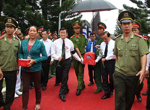 Ông Trương Tấn Sang, Ủy viên Bộ Chính trị, Chủ tịch nước; Lê Thanh Hải, Ủy viên Bộ Chính trị, Bí thư Thành ủy TP.HCM thực hiện lễ đưa di cốt liệt sỹ tới nơi mai táng