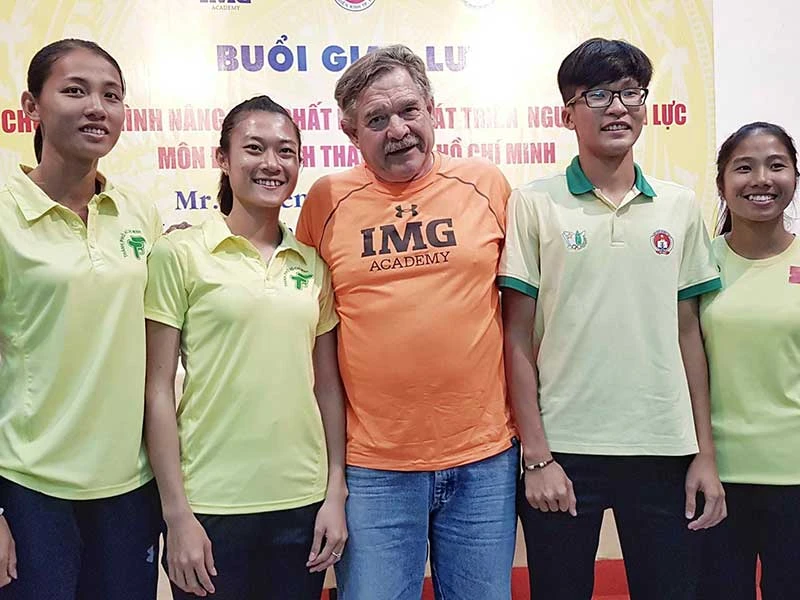 Giám đốc môn điền kinh Học viện thể thao IMG Hoa Kỳ chụp ảnh cùng các tài năng điền kinh TP.HCM. Ảnh: ANH DŨNG
