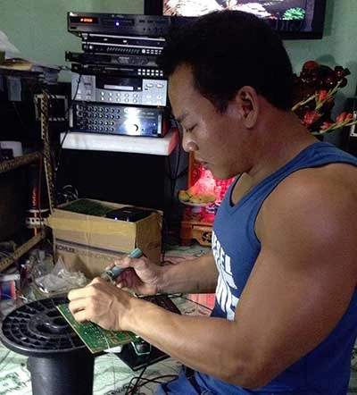 Lực sĩ Lê Văn Công làm thợ sửa điện tử khi còn cùng vợ con ở nhà trọ tại TP.HCM. Ảnh: MQ