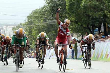 Lê Văn Duẩn (áo đỏ) giành chiến thắng chặng 1 vòng quanh Phú Quốc. Ảnh: MQ
