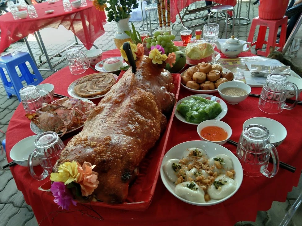 Có gia chủ cúng mâm mặn có heo quay đặt chính giữa |