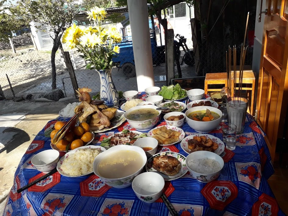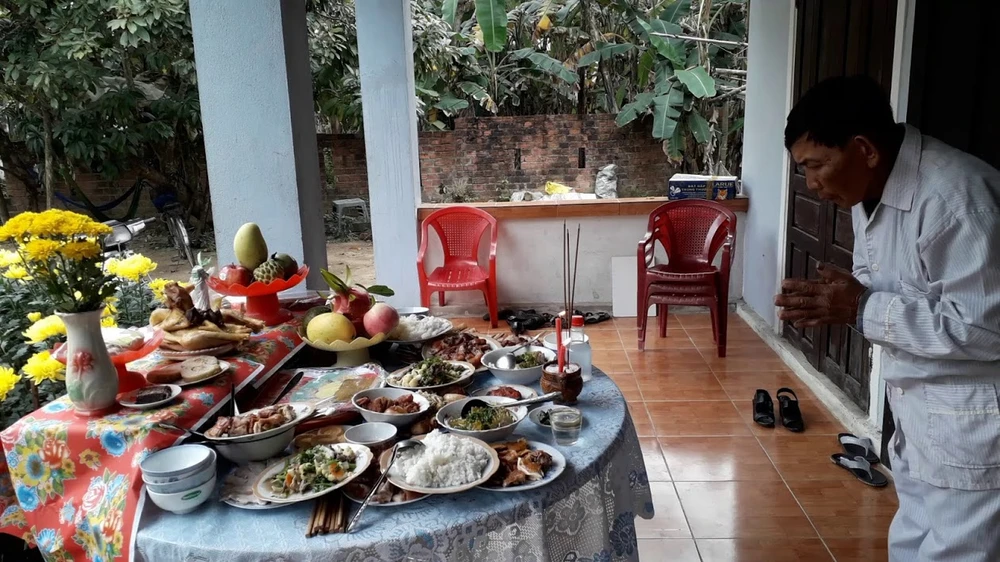 Gia chủ thành tâm khấn vái mâm cúng trước nhà dành cho chiến sĩ trận vong, cô hồn các bác...