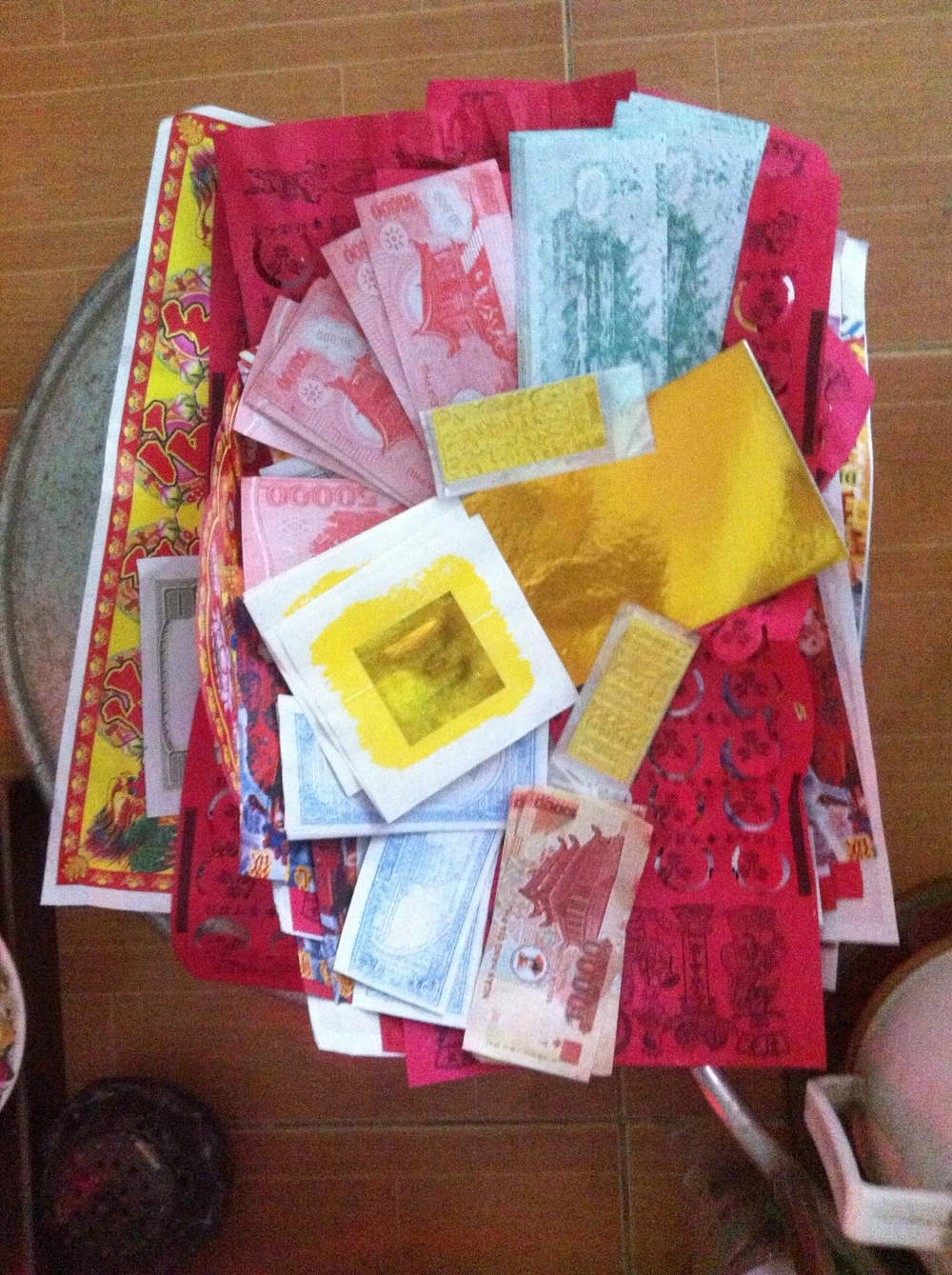 Lễ vật thường là một thổ thịt, bánh hỏi hoặc bánh bò, ba bộ tam sên, mỗi dĩa có một quả trứng luộc, thịt luộc, cua luộc (hoặc tôm luộc). Mâm giấy cúng bên ngoài có bán sẵn.