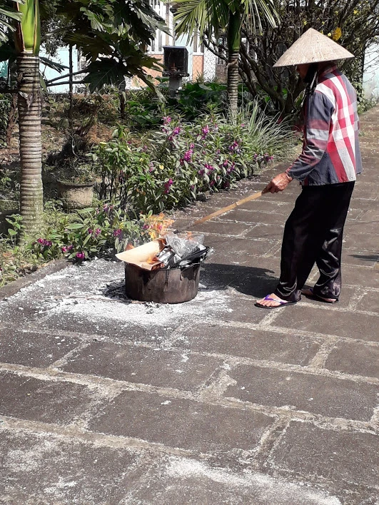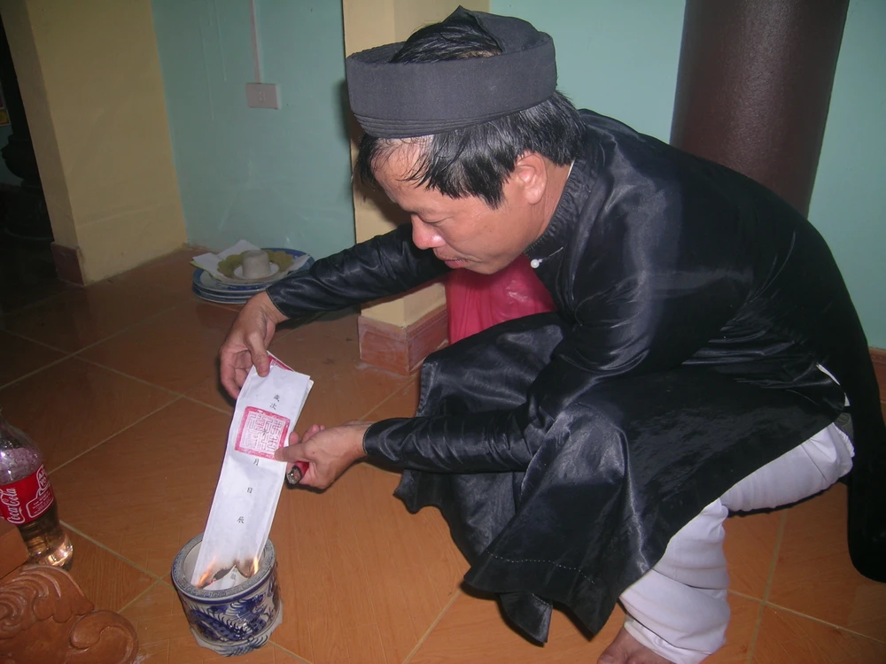 Khi hóa vàng xong thì người ta vẩy vào mấy giọt rượu cúng trên bàn vì tục cho rằng có làm như thế mới thiêng, ở cõi âm các cụ mới nhận được và vàng mã đó mới tiêu được ở âm phủ. Hai cây mía cũng được đem hơ trên đống tàn vàng. Hai cây gậy các cụ theo tín ngưỡng được coi là đòn gánh gánh vàng về cõi âm và là vũ khí chống lại bọn quỷ sứ muốn cướp vàng đi. Trong bữa cơm hóa vàng, con cháu tề tựu đầy đủ, thân mật và sau đó chia tay, chấm dứt mấy ngày tết".