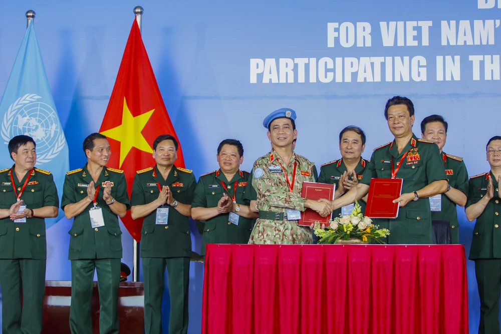 Thiếu tướng Nguyễn Hồng Sơn (bên phải), Giám đốc Bệnh viện Quân Y 175 bàn giao BVDC 2.3 cho Cục trưởng Cục gìn giữ Hòa bình Việt Nam Hoàng Kim Phụng