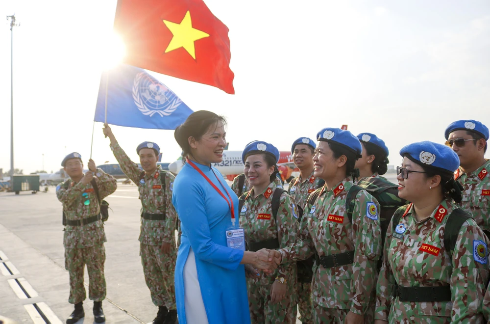 Bà Nguyễn Phương Nga, chủ tịch Hội Liên hiệp các tổ chức Hữu nghị Việt Nam cổ vũ tinh thần cho các cán bộ nữ khi làm nhiệm vụ quốc tế.