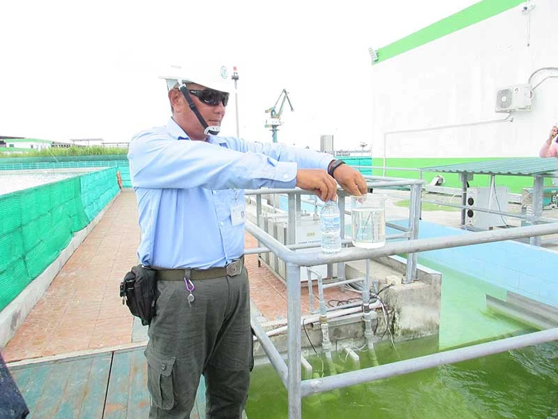 Nhân viên của Lee & Man so sánh độ trong của màu nước trước thải qua bể lắng với màu nước uống đóng chai. Ảnh: NN