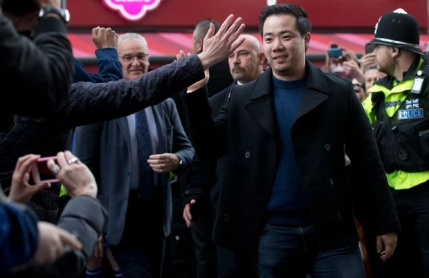Phó chủ tịch CLB Leicester City Aiyawatt cùng HLV Ranieri bước ra khỏi nhà hàng Ý tại Leicester City trong buổi tiệc mừng chiến thắng.