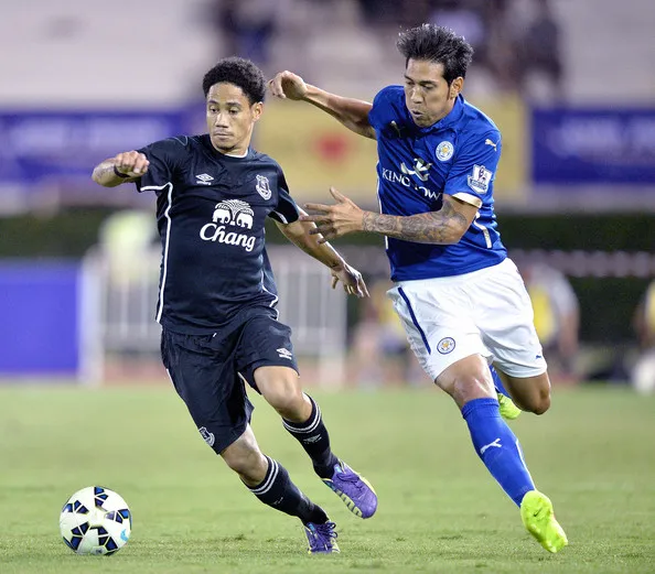 Everton (đen) kéo Leicester City trở lại mặt đất.