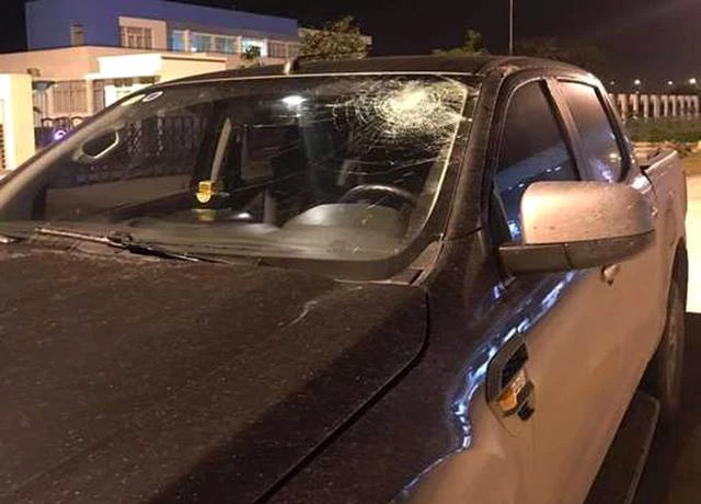 Chiếc xe bán tải bị ném trúng khiến kính lái rạn vỡ