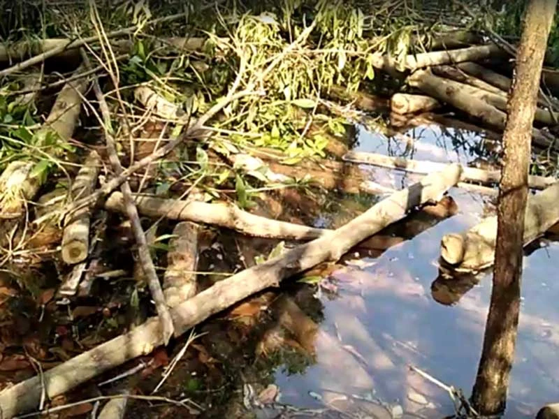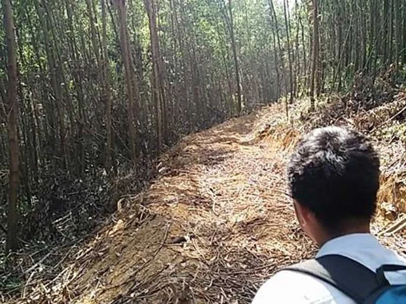 Con đường đủ rộng cho xe tải ben lưu thông. Trên mặt đường là chi chít những vỏ cây gỗ và một số thân cây vứt lại. Dọc hai bên con đường là nhiều gốc cây bị bật tung lên với dấu cưa máy còn mới toanh. Gần cuối con đường là nhiều cây gỗ được tập kết thành từng đống được phủ lá cây để che đậy. Nơi tiếp giáp với mép nước hồ Phú Ninh có rất nhiều cây gỗ được phủ lá, chờ vận chuyển đi tiêu thụ.