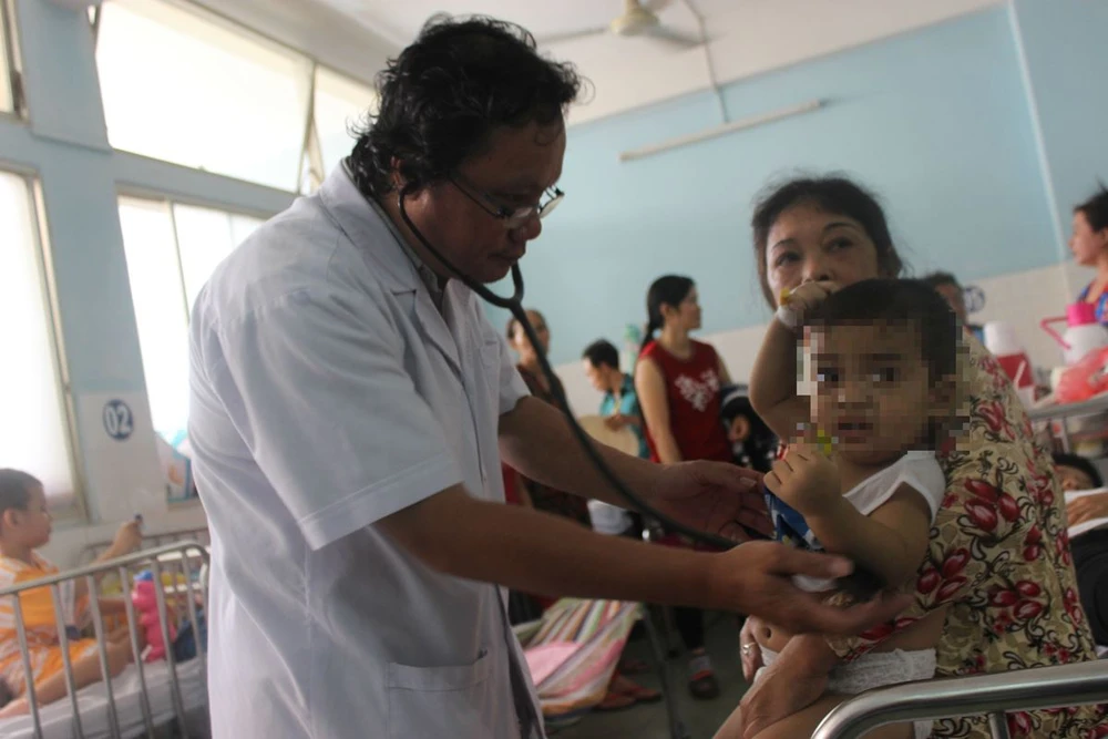 BS Trương Hữu Khanh, Trưởng khoa Nhiễm-Thần kinh BV Nhi đồng 1, đang thăm khám cho bé B. Ảnh: HL