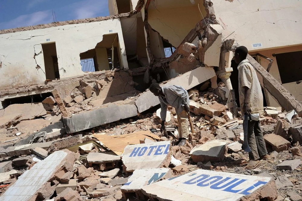 Đống đổ nát của một khách sạn bị cuộc không kích của Pháp phá hủy ở thị trấn Douentza, Mali vào tháng 2-2013. Ảnh: AFP