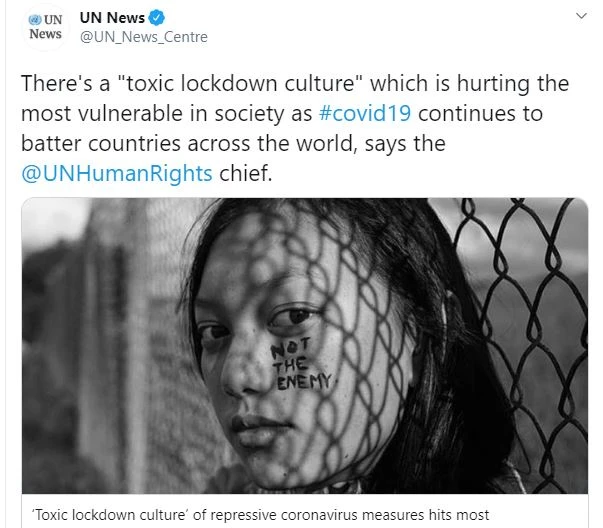 Trang thông tin của Liên Hiệp Quốc nói về "văn hóa phong tỏa độc hại" đang làm ảnh hưởng đến những người dễ bị tổn thương nhất trong xã hội ở một vài quốc gia. Ảnh: TWITTER