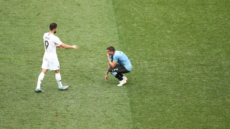 Cầu thủ Pháp chia buồn với đồng nghiệp Uruguay.