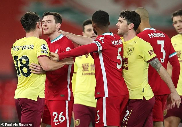 Trước đó, khi trọng tài thổi còi kết thúc hiệp 1, hai đội đã tham gia vào vụ lộn xộn trên sân khởi nguồn từ hành vi nóng nảy của Barnes và Fabinho. Sau khi xem lại VAR, trọng tài Mike Dean rút thẻ vàng phạt Fabinho.