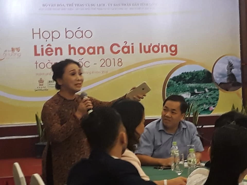 Nghệ sĩ Bạch Tuyết đến dự buổi công bố liên hoan, bà ca một câu cải lương góp không khí.