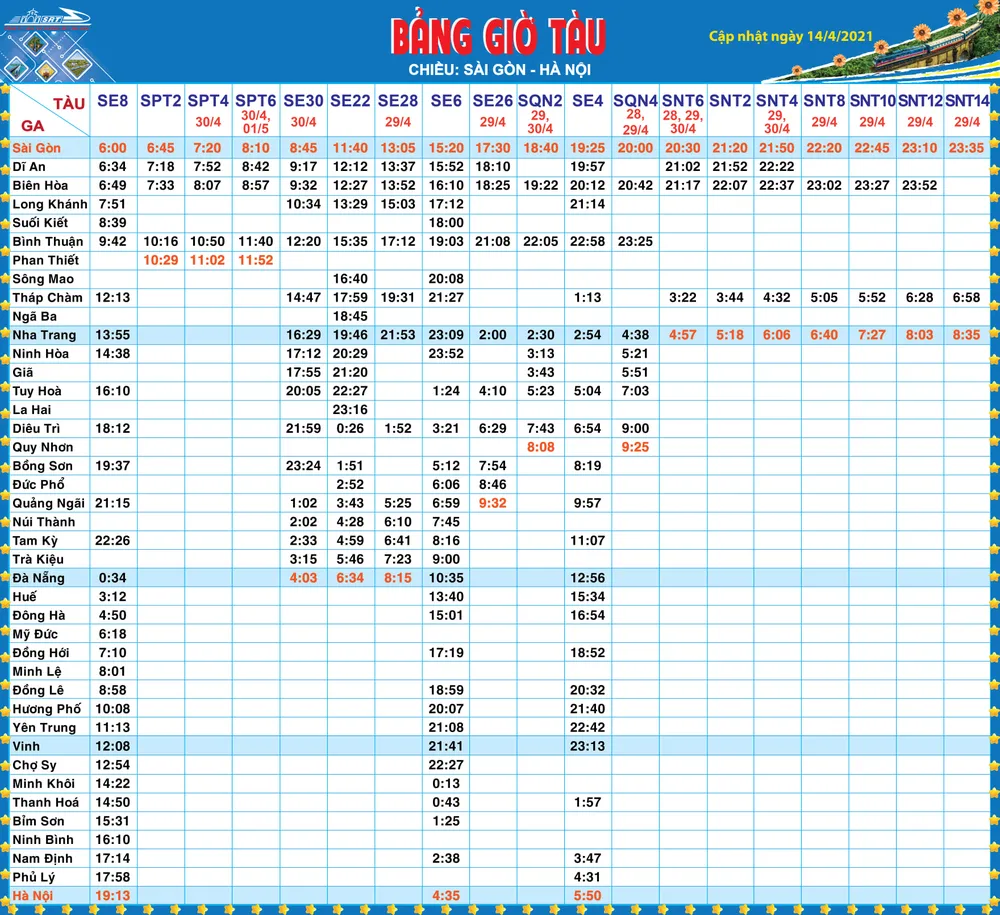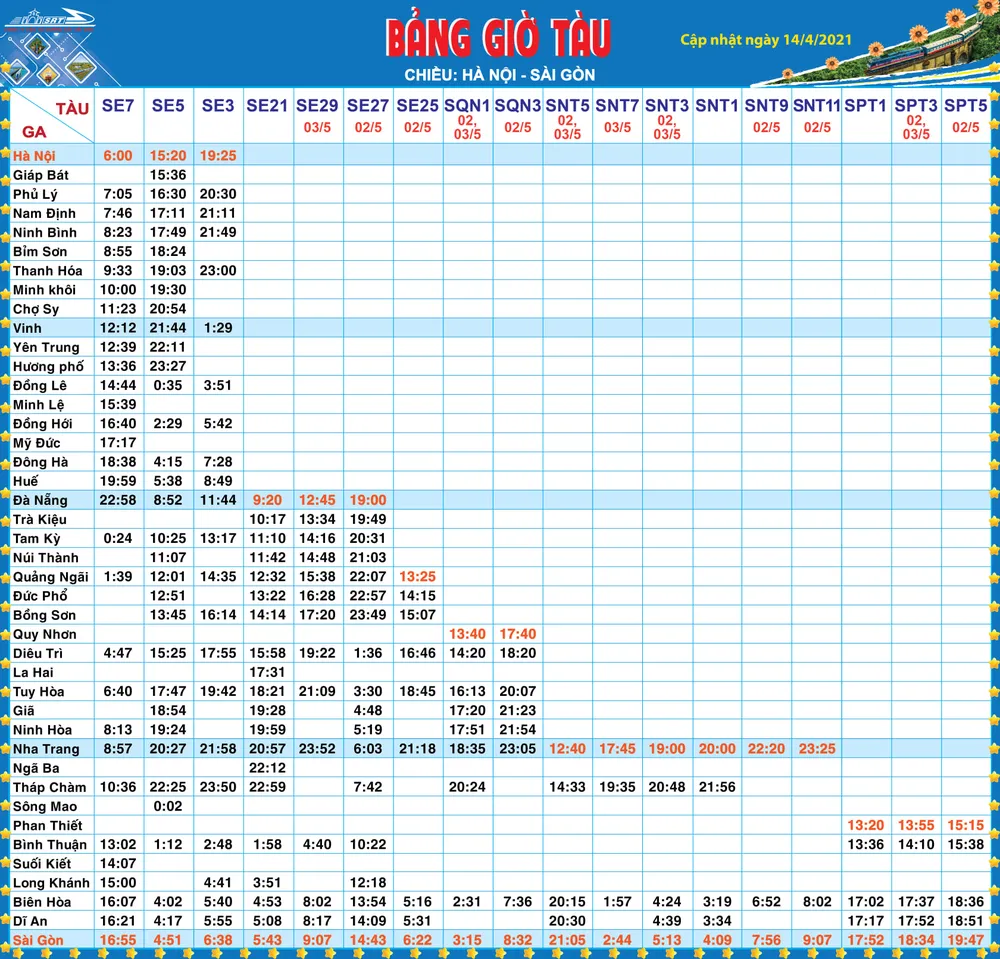Ở chiều ngược lại, tuyến Đà Nẵng - TP.HCM: Tàu SE21 chạy hàng ngày, tàu SE27 chạy ngày 2-5, tàu SE29 chạy ngày 3-5