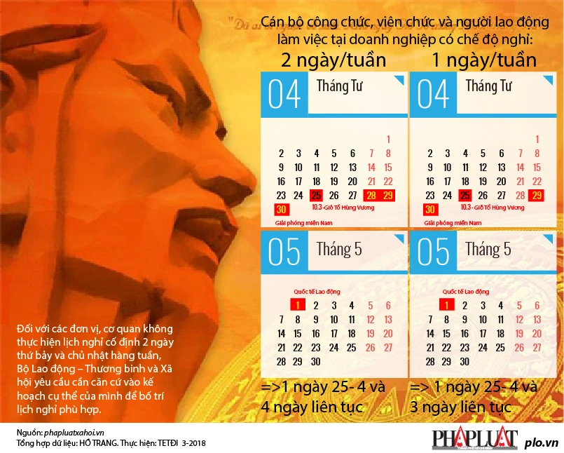 (PLO)- Theo quy định của Luật Lao động, công chức, viên chức và người lao động được nghỉ 1 ngày duy nhất trong dịp giỗ Tổ Hùng Vương 10-3 âm lịch và nghỉ 3 hoặc 4 ngày liên tục đối với dịp lễ 30-4 và 1-5-2018 tùy theo chế độ nghỉ tại cơ quan, doanh nghiệp như sau: