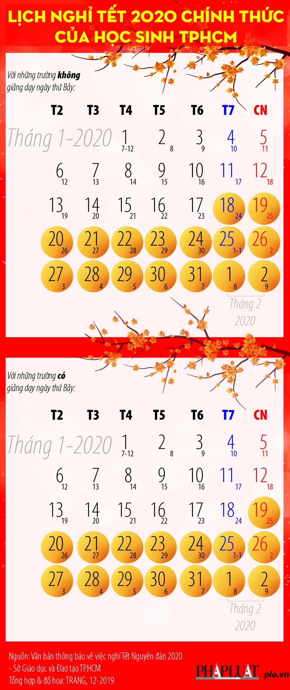Lịch nghỉ tết 2020 chính thức (PLO)- Dưới đây là lịch nghỉ Tết Nguyên đán Canh Tý 2020 chính thức theo Văn phòng Chính phủ.