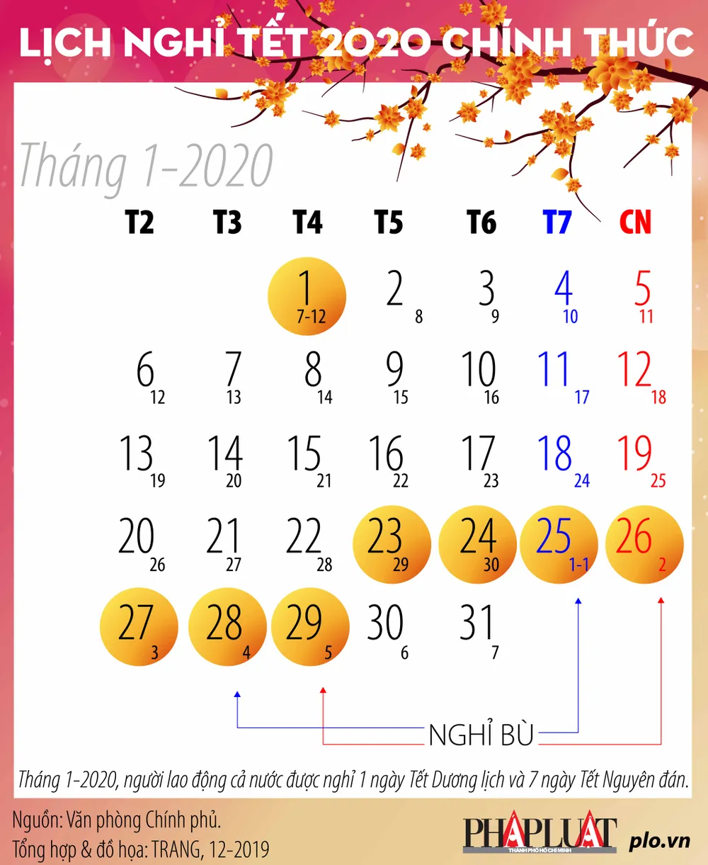 (PLO)- Dưới đây là lịch nghỉ Tết Nguyên đán Canh Tý 2020 chính thức theo Văn phòng Chính phủ.