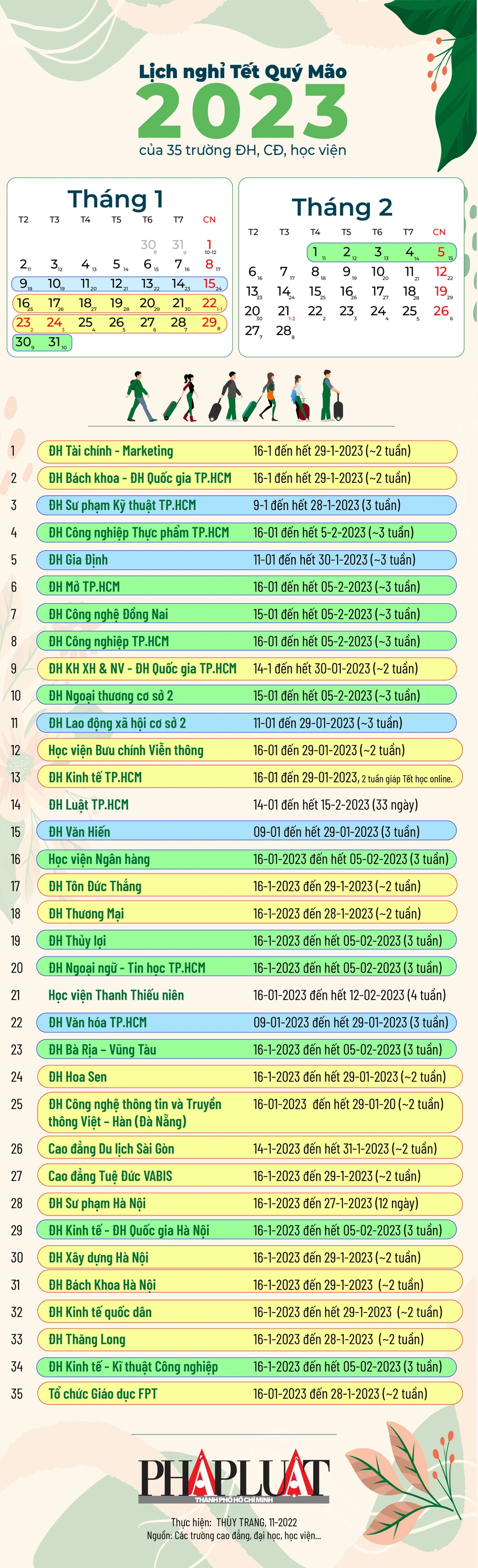 (PLO)- Trong lịch nghỉ Tết Quý Mão 2023 của 35 trường ĐH, CĐ, học viện trên cả nước, có đến 17 trường cho nghỉ tết cỡ 2 tuần. Cá biệt, có trường cho nghỉ tết đến 33 ngày.